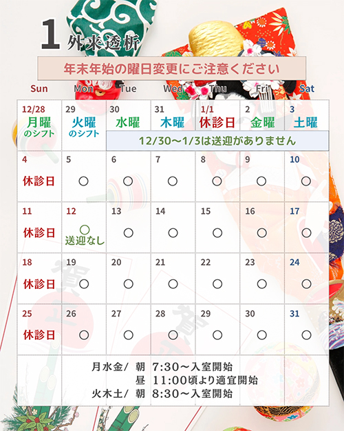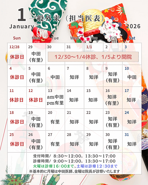 年末年始は1/1(木)を休診日とするため、シフトが変更となりますのでご注意ください。