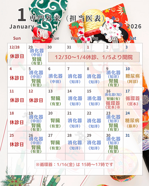 12/30(火)〜1/4(日)まで一般外来は休診です。
