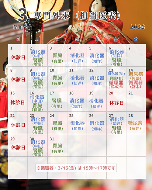一般外来・専門外来・外来透析の担当医、日程は下記の通りとなっております。