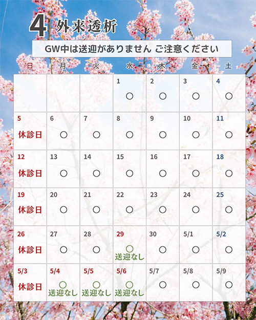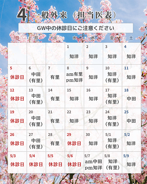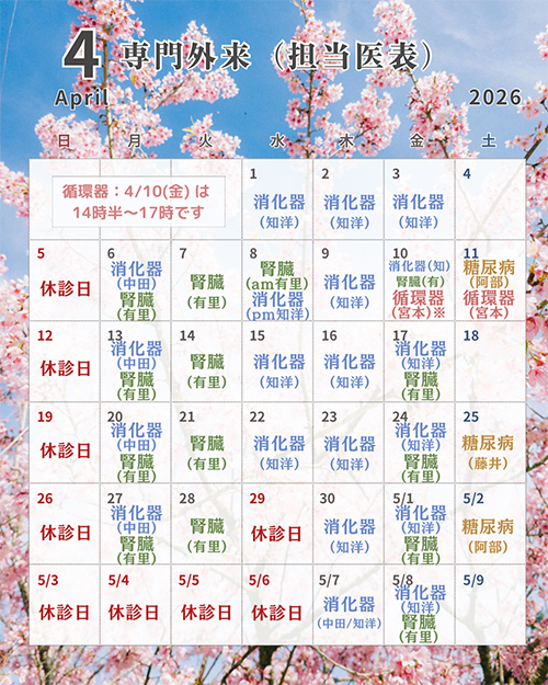 一般外来・専門外来・外来透析の担当医、日程は下記の通りとなっております。